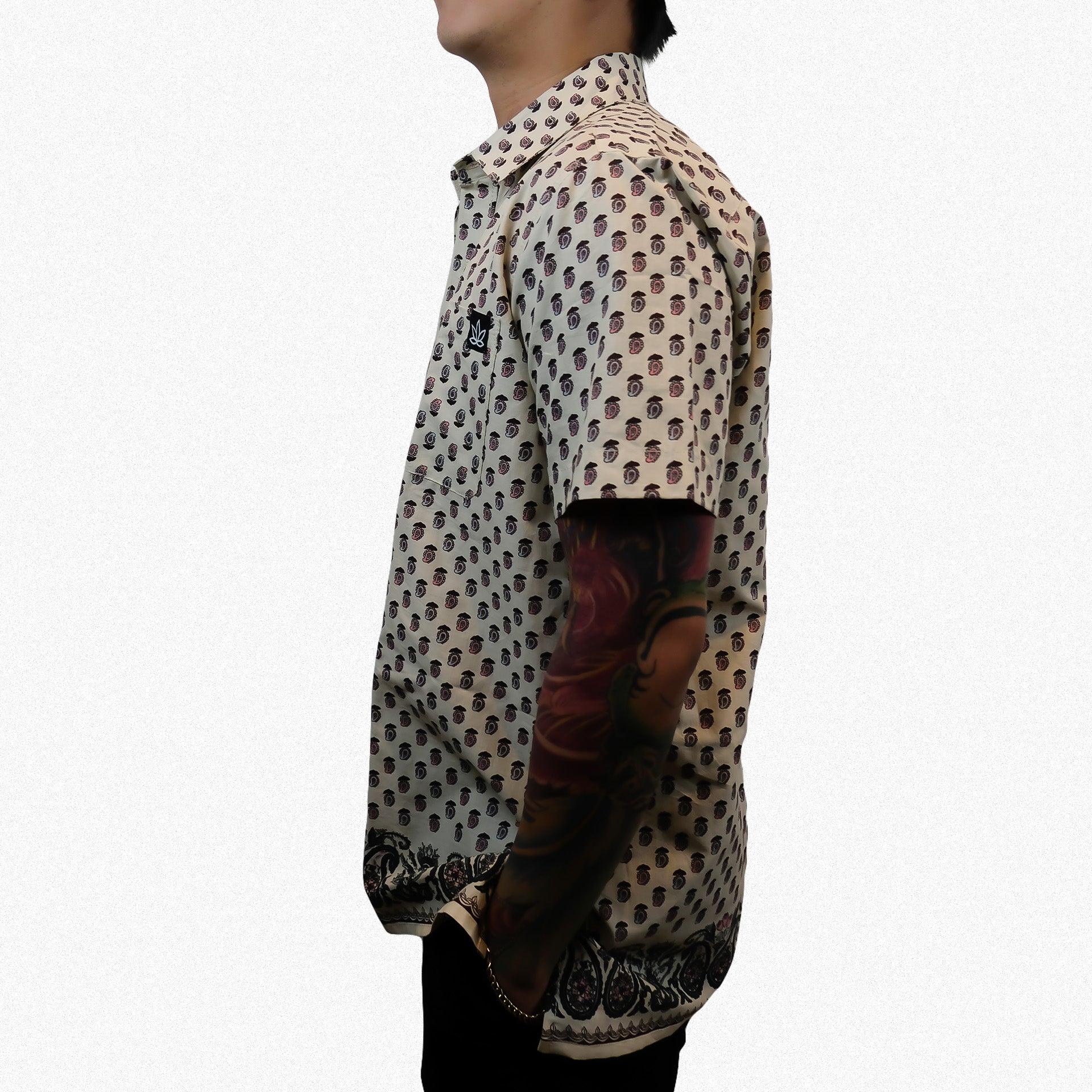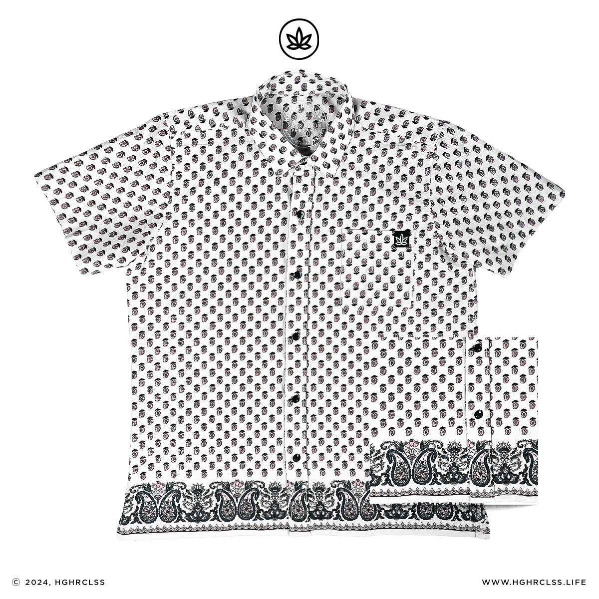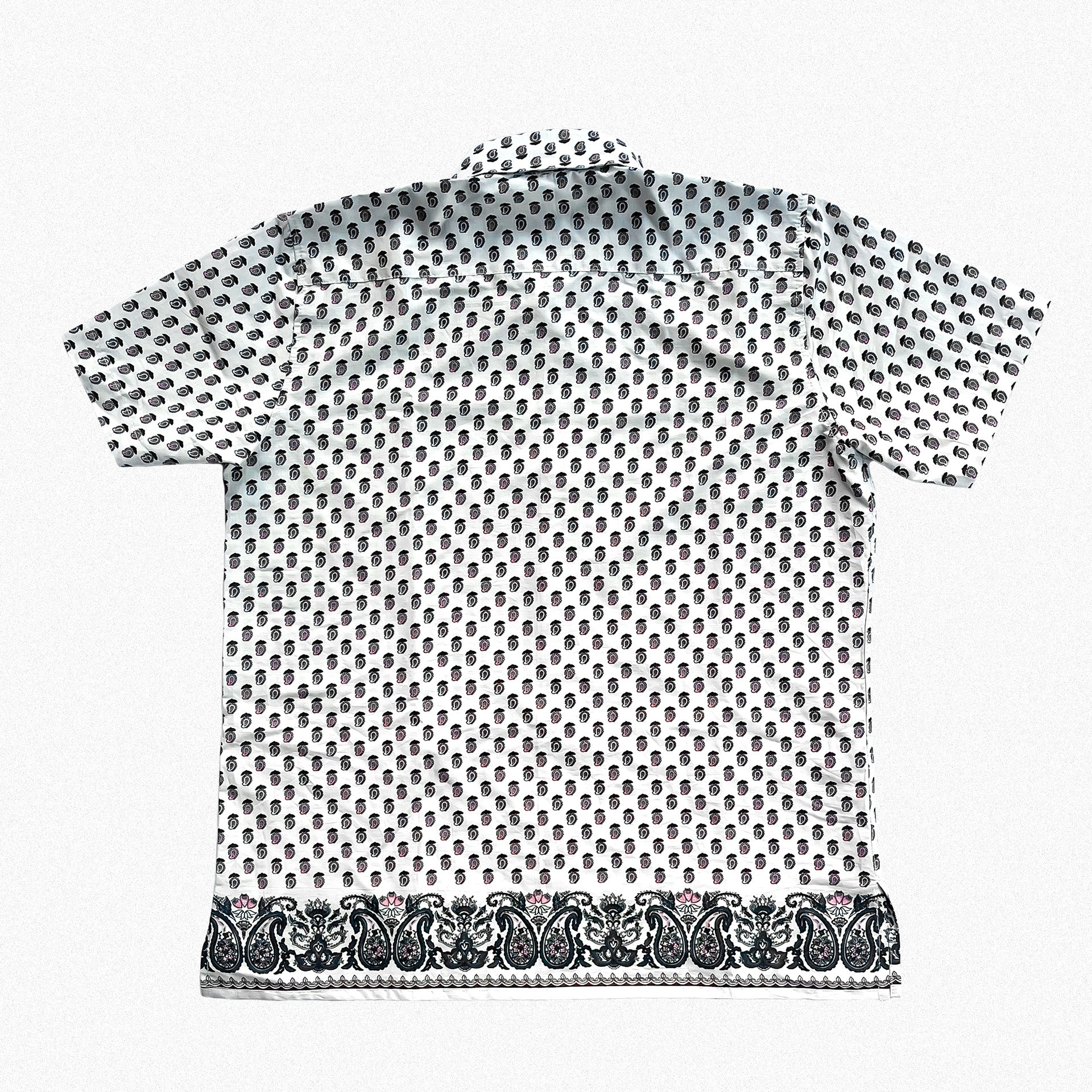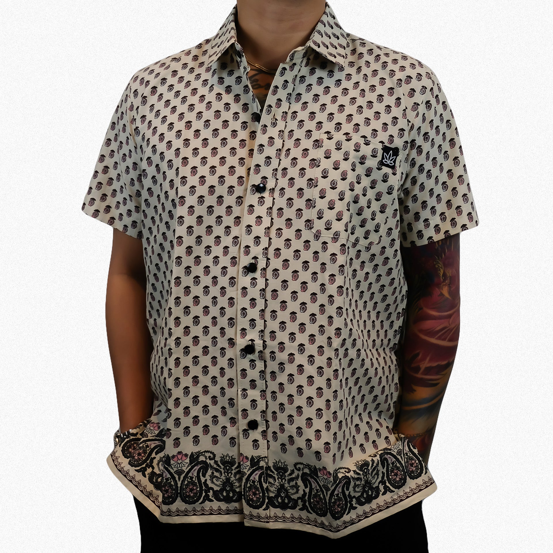 Paisley patterned, button-up shirt with one front pocket and detailed print on the bottom.