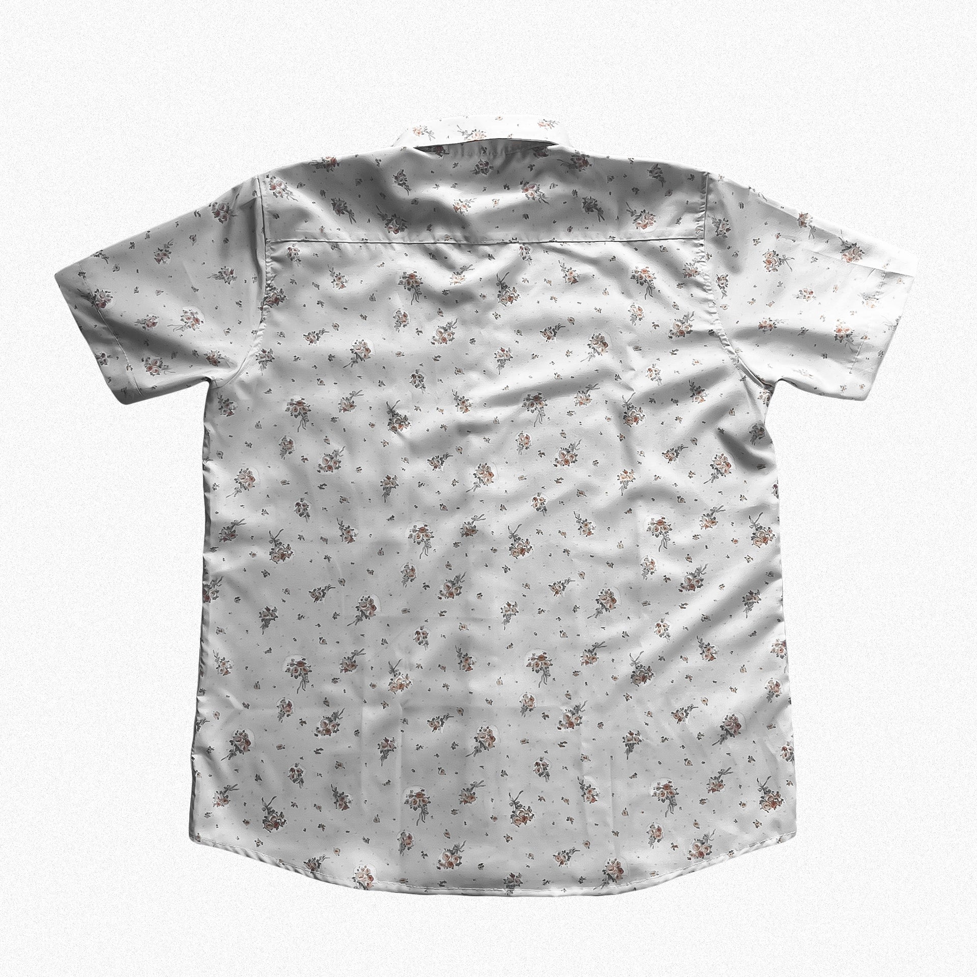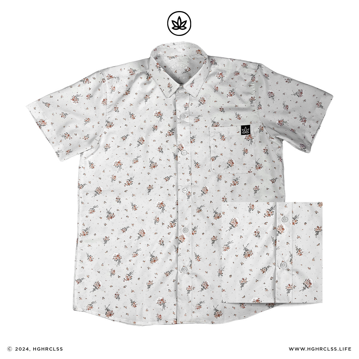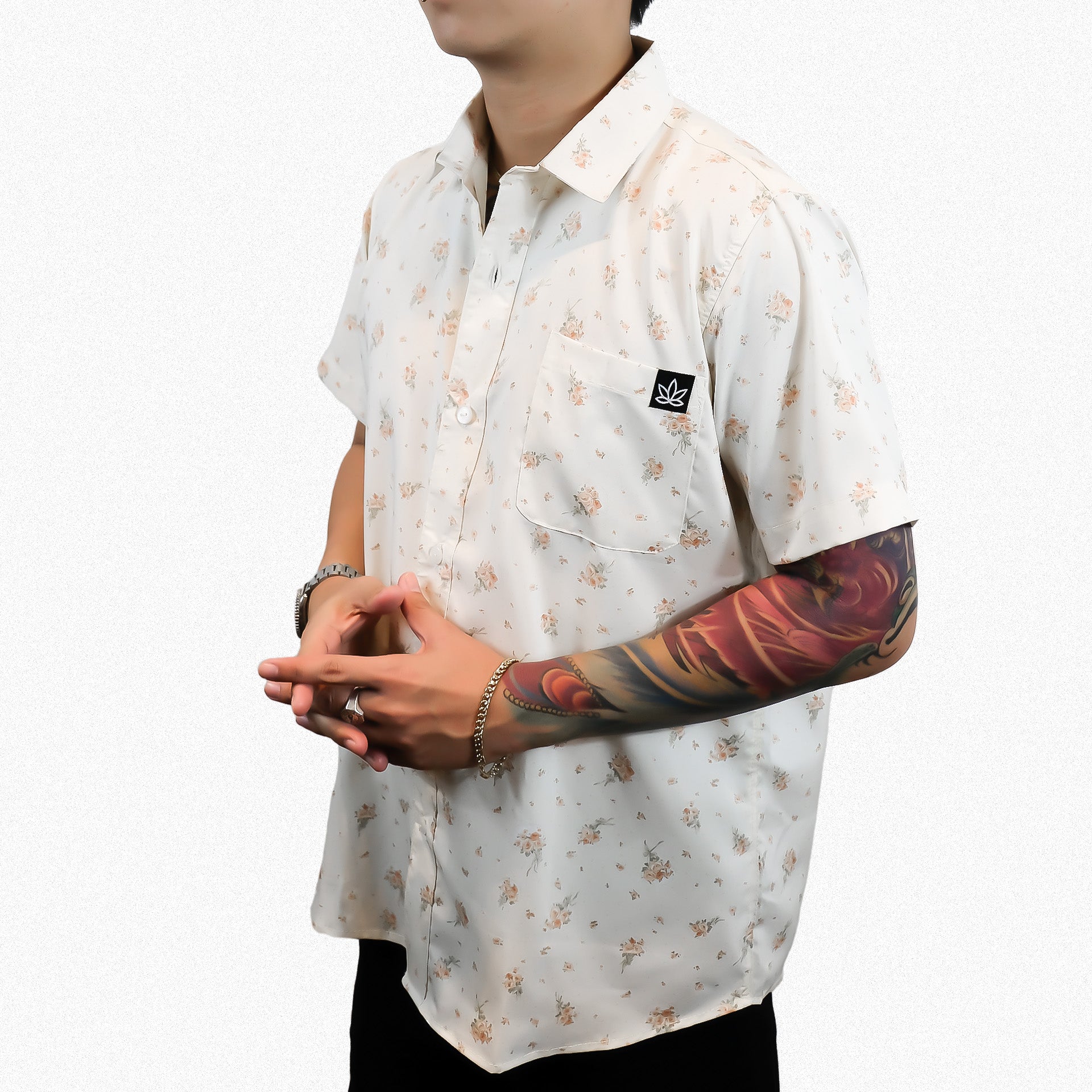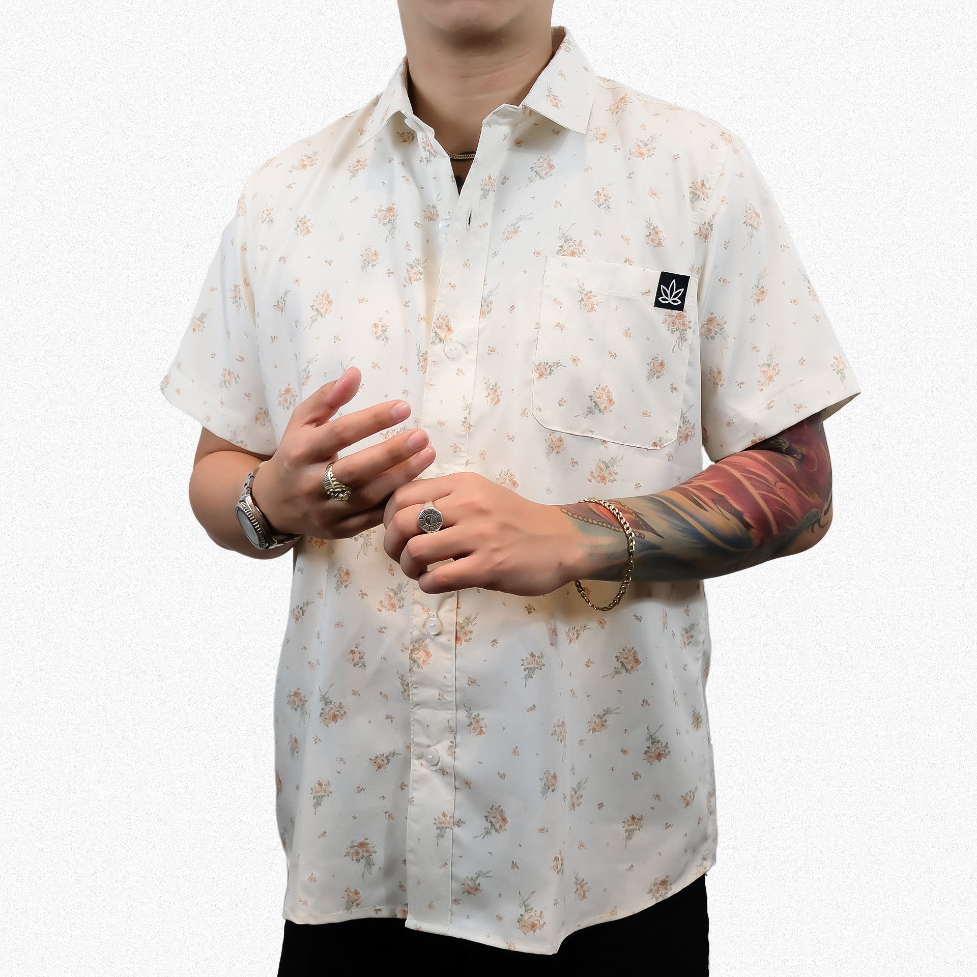Floral cream button-up shirt with one front pocket and amboy bottom cut, fit for any occasion.