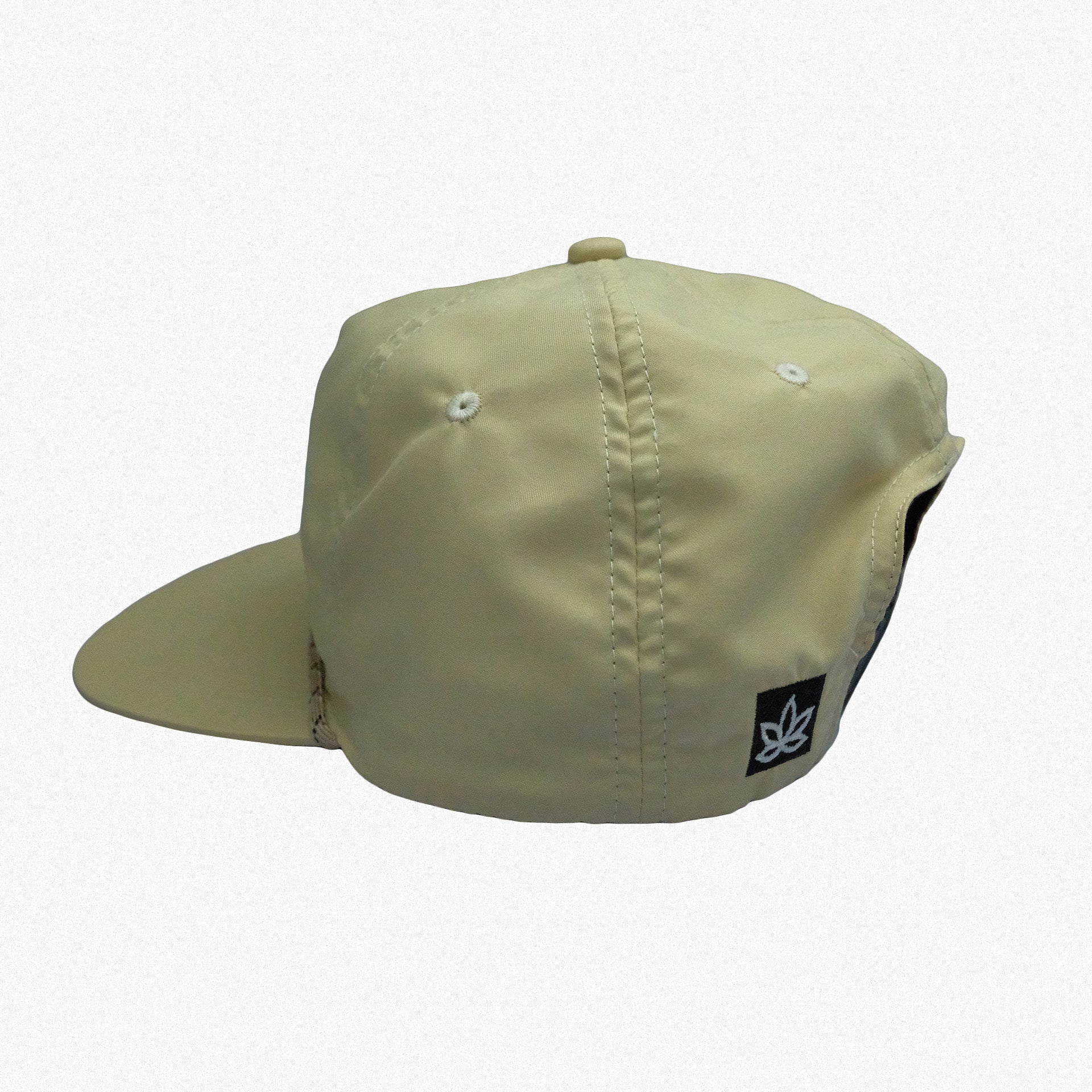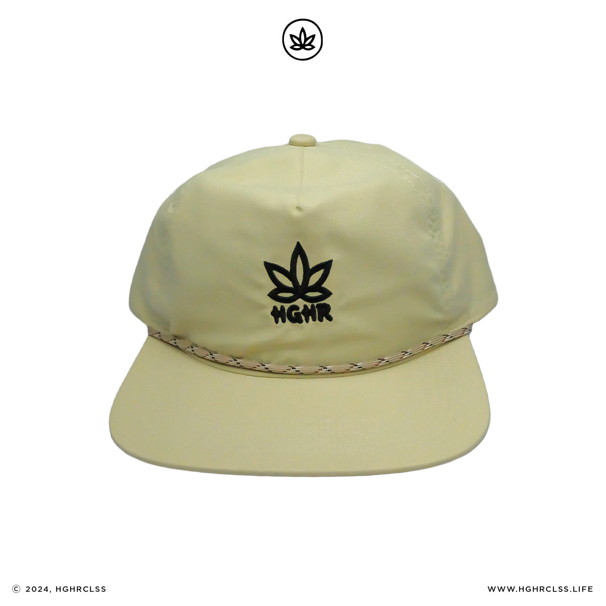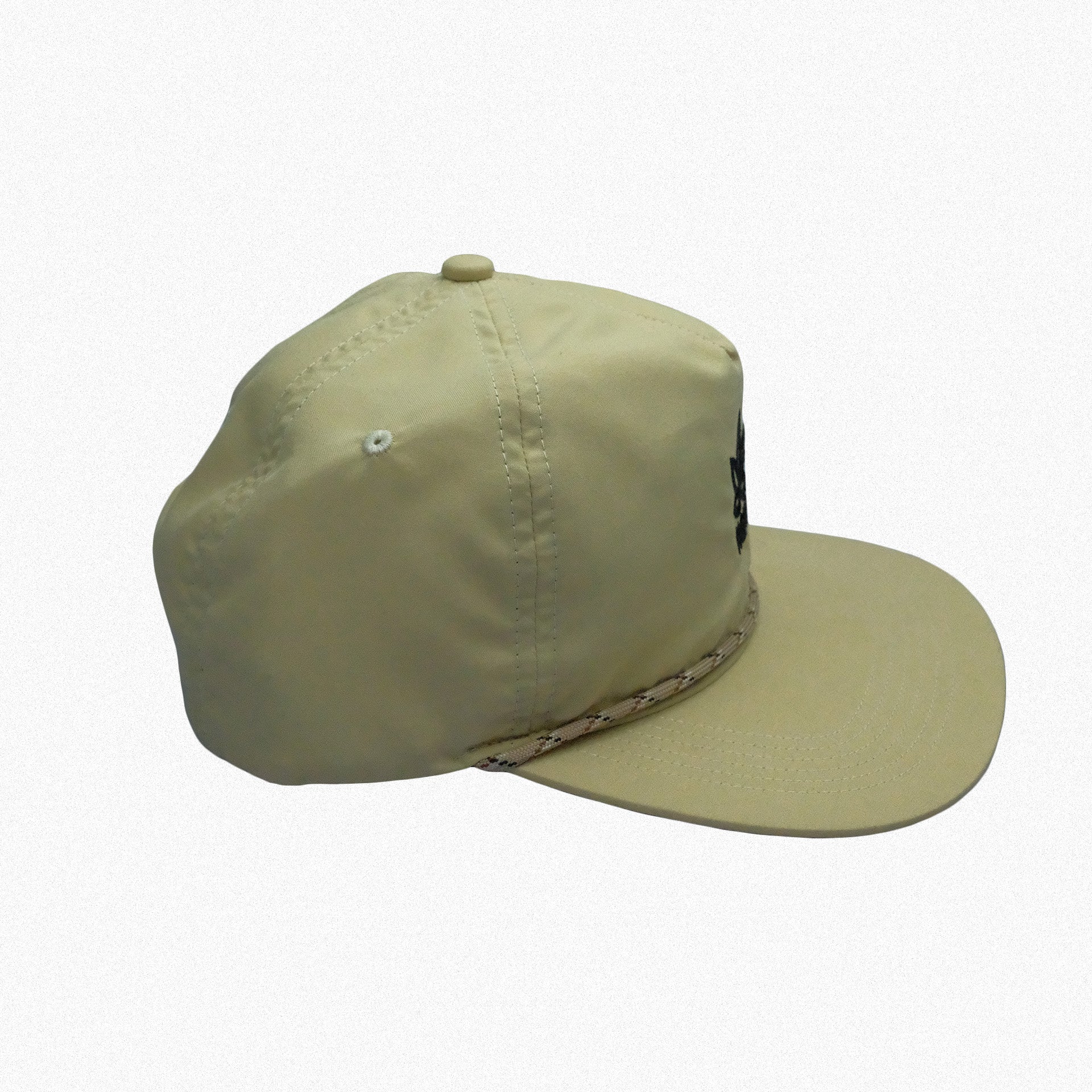 Unstructured snapback hat made with quick-dry microfiber fabric in khaki color. Embroidered HGHR logo in the front and back and fitted with paracord accessory in the front.